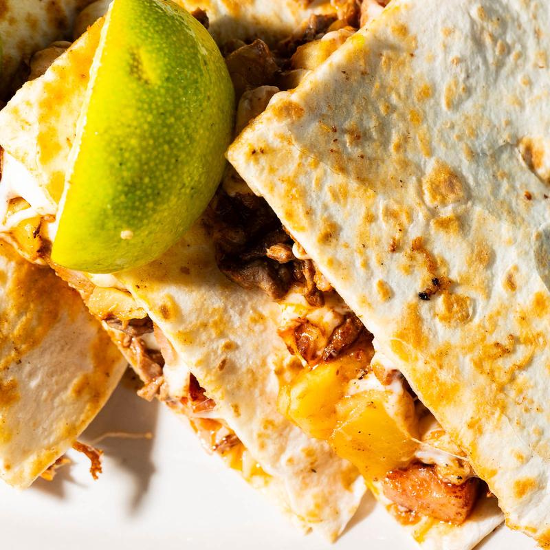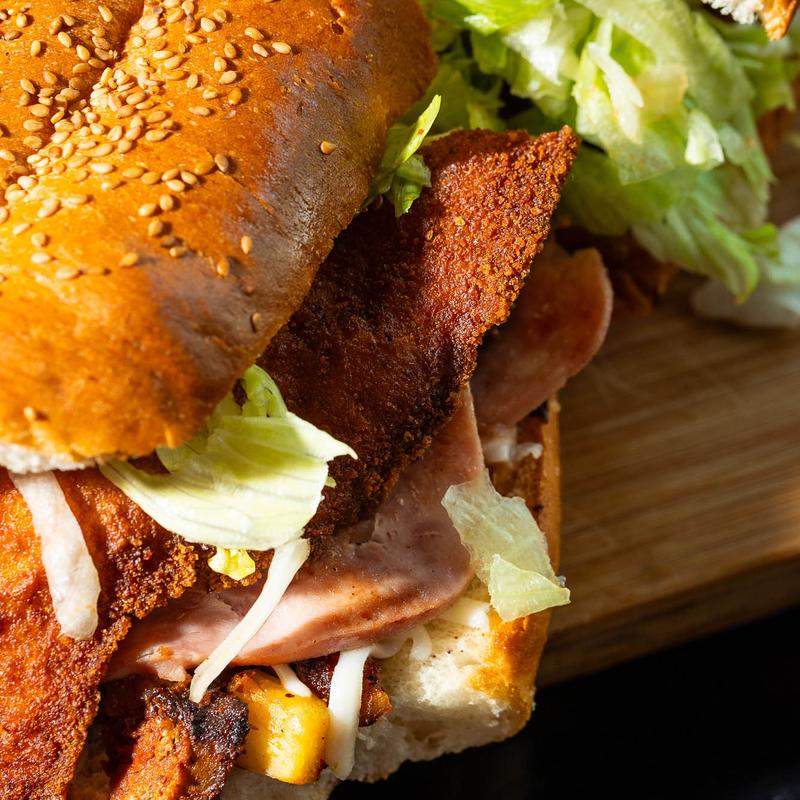 Marinated pork, grilled, seasoned steak, ham, bacon, cheese, and pineapple.