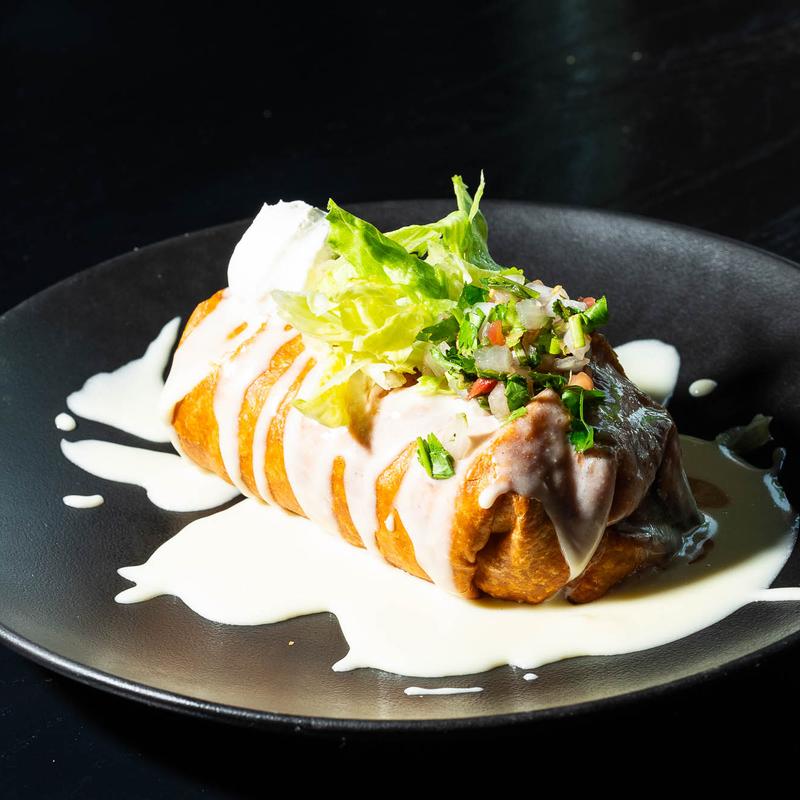 Bacon-wrapped flour tortilla with choice of steak or chicken, avocado, chipotle dressing, green pepper, rice, beans, and cheese.