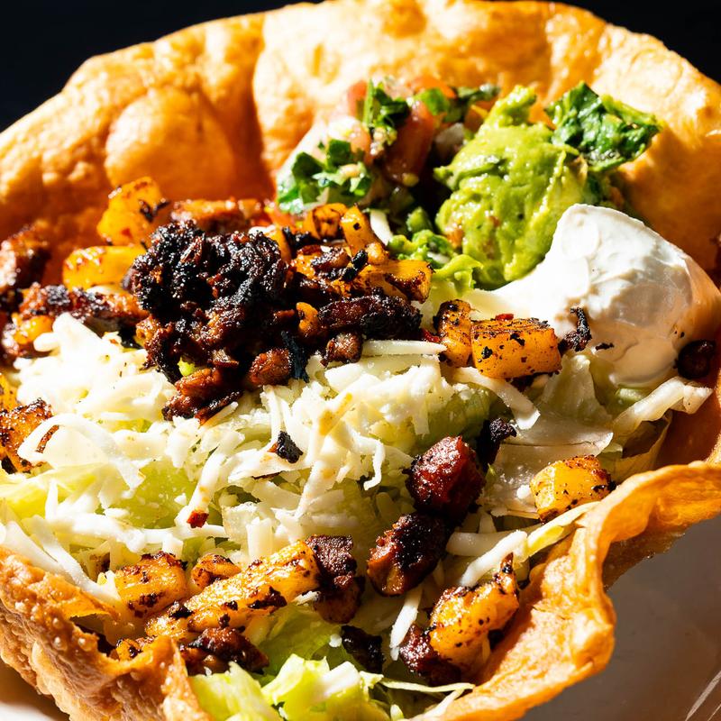 Fresh fried tortilla shell, choice of chicken or steak, topped with lettuce, cheese, tomatoes, guacamole, and sour cream.